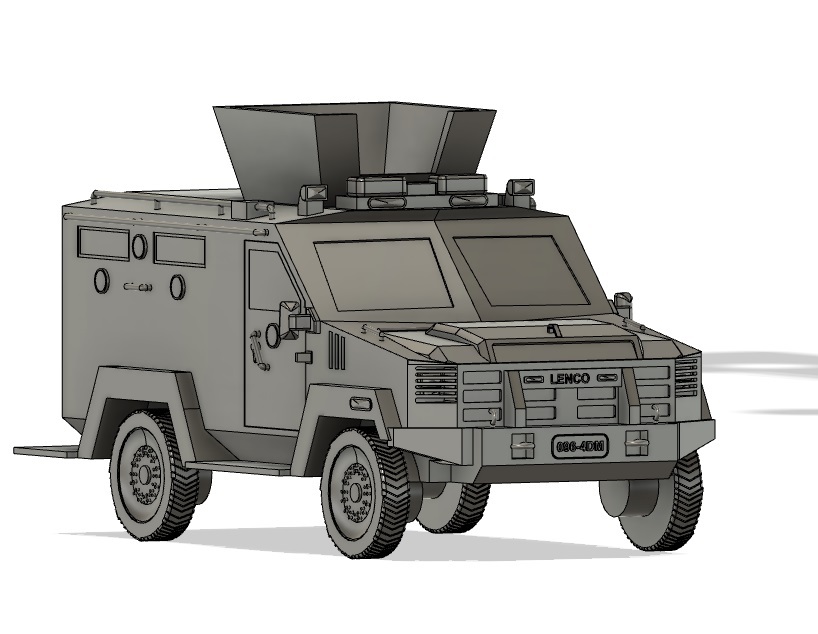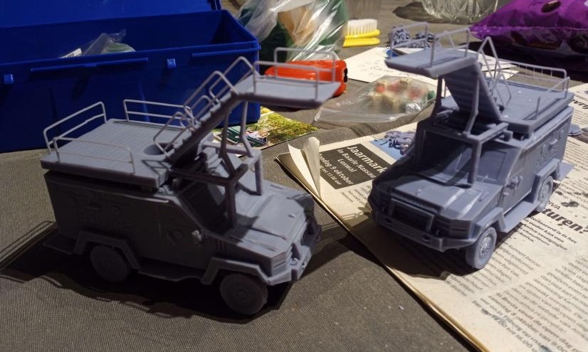 This set contains two highly detailed BearCat trucks based on multiple versions of the Lenco BearCats. This set contains 1 General BearCat and 1 Police BearCat. In addition, they come with modular top hatches including a closed top hatch, a protected top hatch, a water cannon (including homemade rules to be used in a (ultra-)modern wargame and an Assault Ladder platform to storm a second floor of a building.